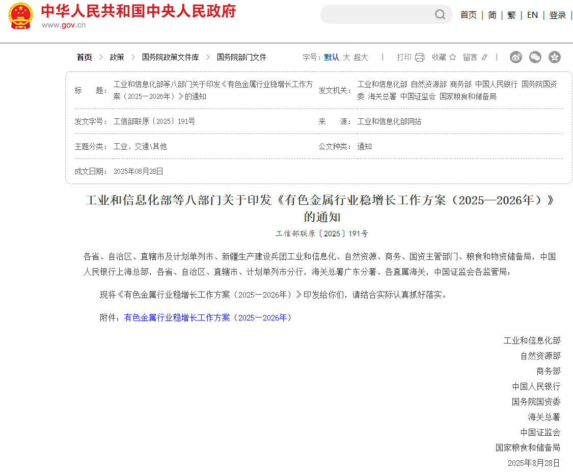 工業和信息化部等八部門關于印發《有色金屬行業穩增長工作方案(2025—2026年)》的通知